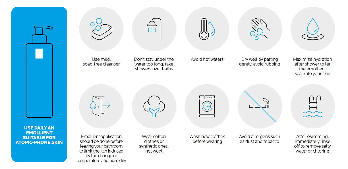 Atopic dermatitis (AD) is the most common chronic inflammatory skin disease causing itchiness. It is characterized by a damaged skin barrier, a skin inflammation, and an imbalanced skin microbiome. As for the visible signs, redness, erythema and scaly patches are most common. Even in patients with a typical distribution and morphology of lesions, the appearance of AD varies based on skin colour. Erythema in darker skin is more likely to appear violaceous or may be missed completely.