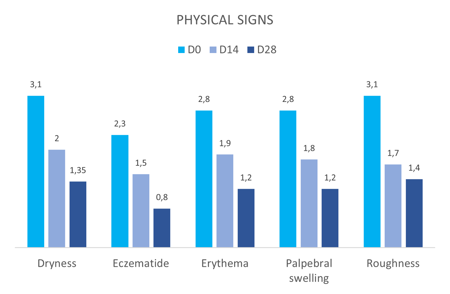 After 14 and 28 days TOLERIANE DERMELLERGO EYES significantly lowers the intensity of the following physical signs with a minimum of 55%: