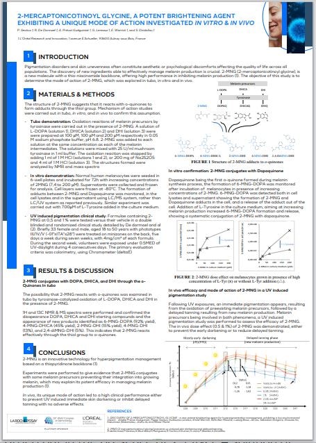 Pigmentation disorders and skin unevenness often constitute aesthetic or psychological discomforts affecting the quality of life across all populations. The discovery of new ingredients able to effectively manage melanin production is crucial. 2-MNG (2-mercaptonicotinoyl glycine), is a new molecule with a thio-niacinamide backbone, offering high performance in inhibiting melanin production. The objective of this study is to determine the mode of action of 2-MNG, which was explored in tubo,